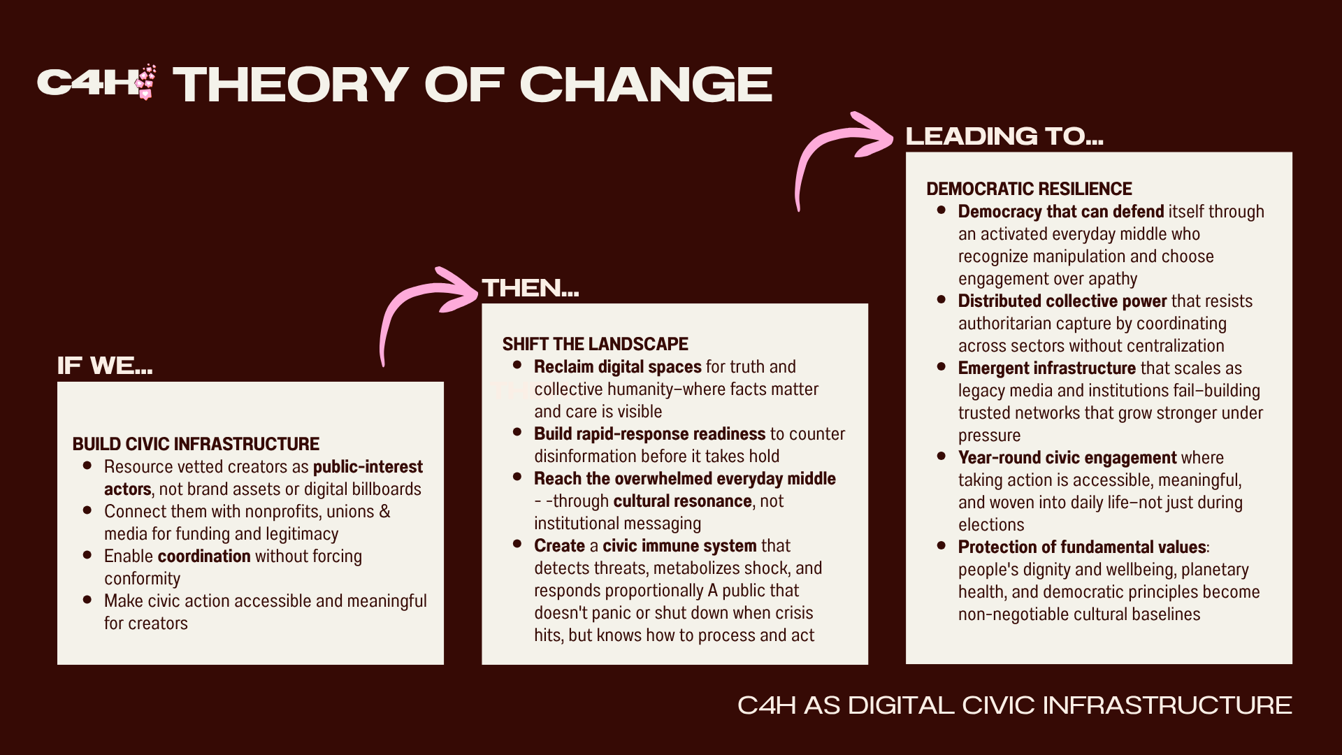 C4H is civic infrastructure for Canada’s digital public square. We coordinate trusted creators, unions, nonprofits, independent media, and organizers so truth is visible, defenders move together, and the public knows what to do.